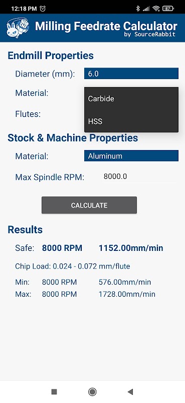 อัลกอริทึมจะคำนวณอัตราป้อนและความเร็วสำหรับเครื่องมือที่มีเส้นผ่านศูนย์กลางตั้งแต่ 0.25 มม. ถึง 40 มม. สำหรับงานกัดโลหะเช่นอลูมิเนียมเหล็กหล่อเหล็กทองเหลืองและสแตนเลส