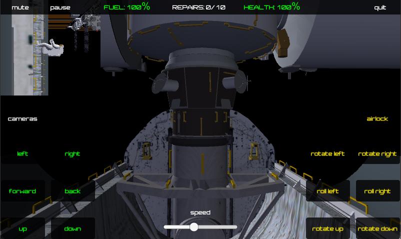 This MMU simulator is equipped with 12 movement controls, speed control, and a button which will automatically point you in the direction of the airlock in an emergency. In addition, each repair has it own camera view to help you locate it during free flight plus your own camera view to help you avoid collisions. During the rescue mission you will be equipped with station wide camera views plus positioning and distance data. Check out the 'cameras' button.