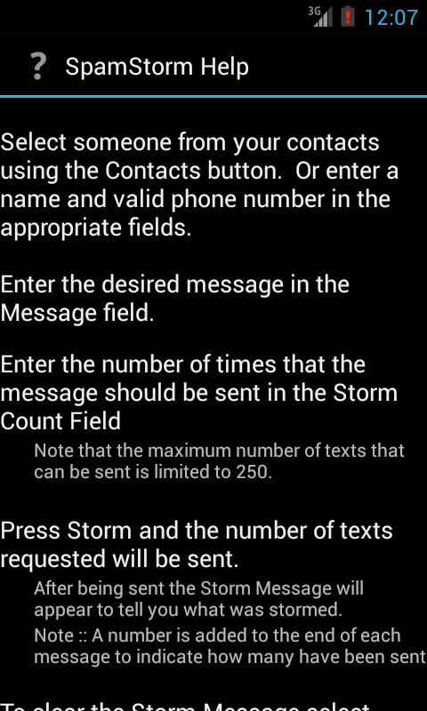 Welcome to Spam Storm. For those moments when you really need to get your point across. For those times when your friends think it is funny to text you over and over again. Well now you can get even with the touch of a button.
