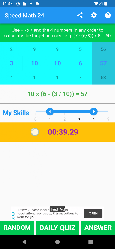 ใช้ตัวดำเนินการทางคณิตศาสตร์ง่ายๆ ( + - x / )และตัวเลข 4 ตัวที่กำหนดไว้ในลำดับใดก็ได้เพื่อคำนวณตัวเลขเป้าหมาย เช่น (7 - (6/8)) x 8 = 50
