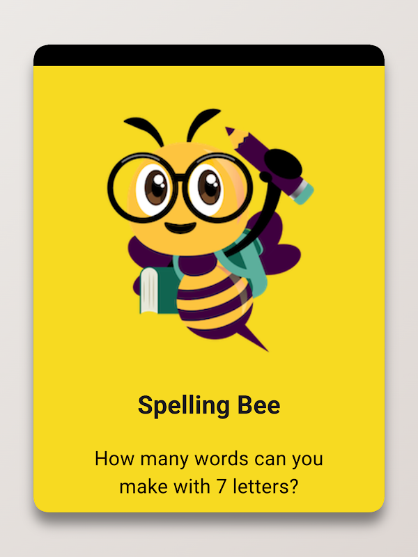 คำสำคัญ: Spelling Bee, เกมคำศัพท์, คำศัพท์, ปริศนา, การศึกษา, ความท้าทาย, ผู้ชื่นชอบคำศัพท์, ความสนุกสนาน, การเรียนรู้, ความสามารถในการสะกดคำ, ความรู้คำศัพท์, ระดับ, งานอดิเรก, ความบันเทิง, ของเล่นพัฒนาสมอง, ทักษะทางภาษา, การเล่นออฟไลน์, ความท้าทายรายวัน