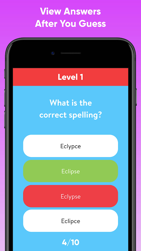 เกมนี้มีหลายระดับความยากที่แตกต่างกัน หากต้องการปลดล็อกแบบทดสอบถัดไป คุณต้องทำคะแนนได้ 5/10 คำถามแต่ละข้อมีคำตอบที่เป็นไปได้ 4 คำตอบ คุณต้องเลือกคำตอบที่มีการสะกดคำที่ถูกต้อง มีแบบทดสอบทั้งหมด 50 แบบให้ลองทำ