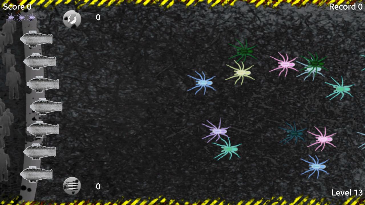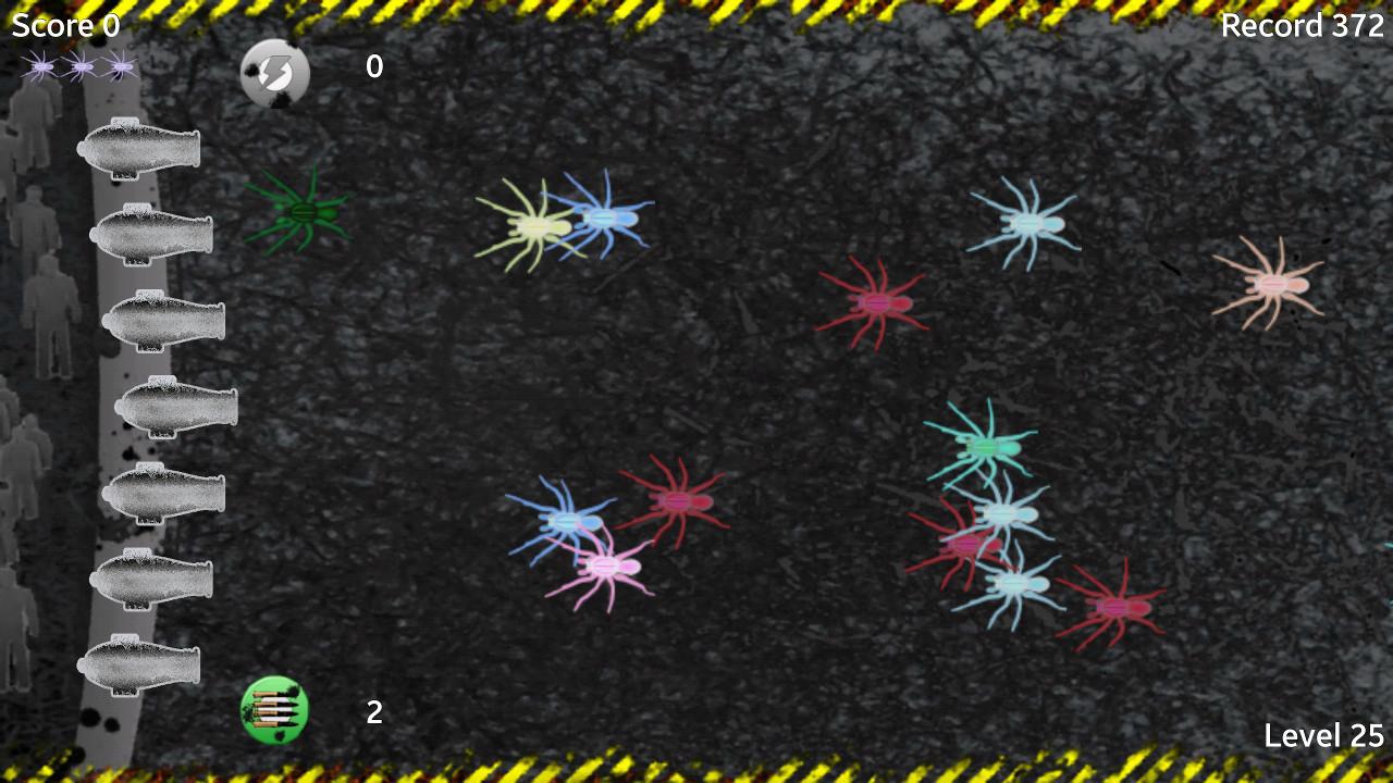 Spider Attack is a game where you have to defend yourself from the attack of the spiders. To do this you have the air guns and occasionally a ray fulminant. To shoot, simply click on the most suitable cannon to hit the spiders. There are two game modes: Arcade and By Level. In arcade mode the goal is to survive to gain access to the next level and beat the overall record. By Level mode you can select the level to play with (1 to 25) with the aim of improving the level of the single surviving record as much as possible.
