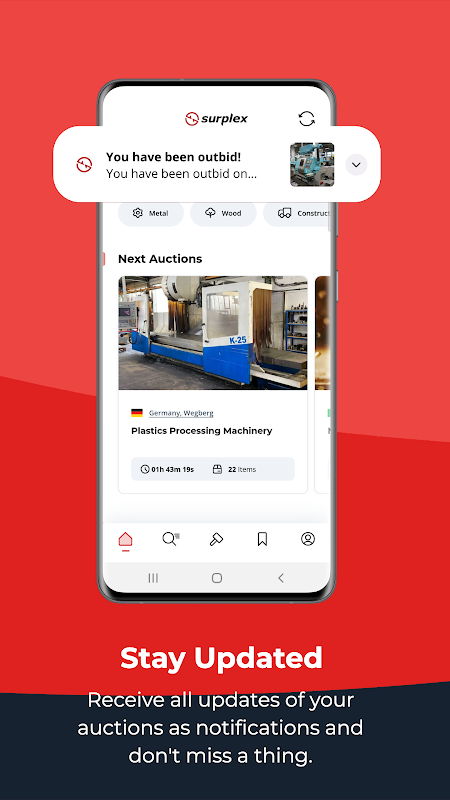 แต่ไม่ใช่แค่การเรียกดูและค้นพบเท่านั้น Surplex ช่วยให้คุณอัปเดตสถานะปัจจุบันของการประมูลทุกครั้งอย่างต่อเนื่อง ไม่ว่าคุณจะถูกเสนอราคาสูงกว่าหรือชนะการประมูล คุณจะได้รับการแจ้งเตือนทันที เพื่อให้มั่นใจว่าคุณจะไม่พลาดสิ่งสำคัญ