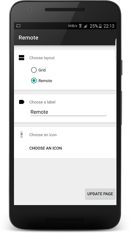 • Grid-Layout with items for custom commands or remote-layout for controlling any kind of mediaplayers,tv's,...