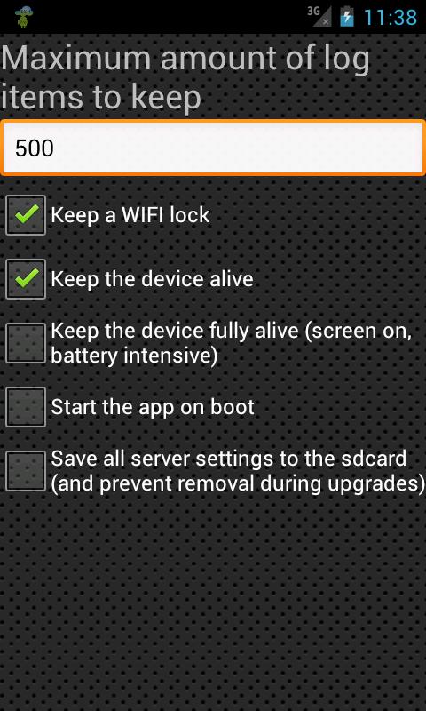- On the settings page of the app you can set the maximum log items to keep, whether to keep a WIFI lock (prevent WIFI from disconnecting automatically), keep the device alive, keep the device alive full (keep the screen on, battery intensive), set to start the app on boot
