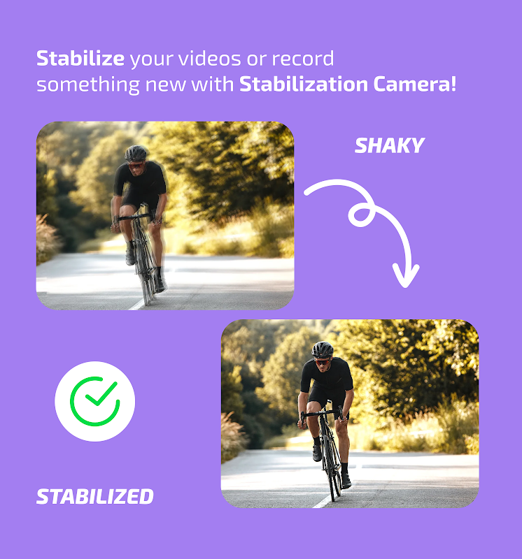 แอปพลิเคชันกล้องลดการสั่นไหวจะทำให้วิดีโอที่บันทึกในแอปมีเสถียรภาพอย่างรวดเร็วและอัตโนมัติ ไม่ว่าจะสั่นคลอนหรือไม่เสถียรก็ตาม แชร์วิดีโอที่มีความเสถียรซึ่งดูเหมือนคุณใช้ขาตั้งกล้องในการถ่ายทำ!