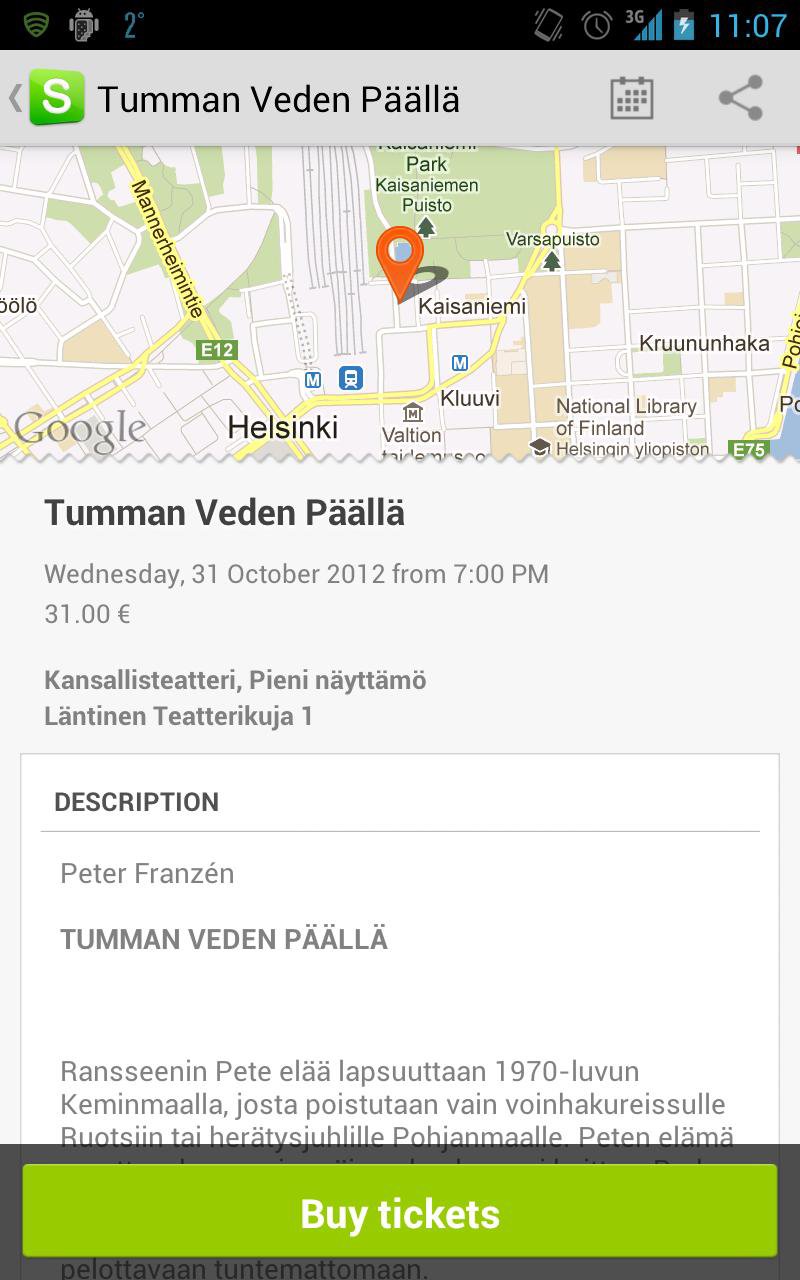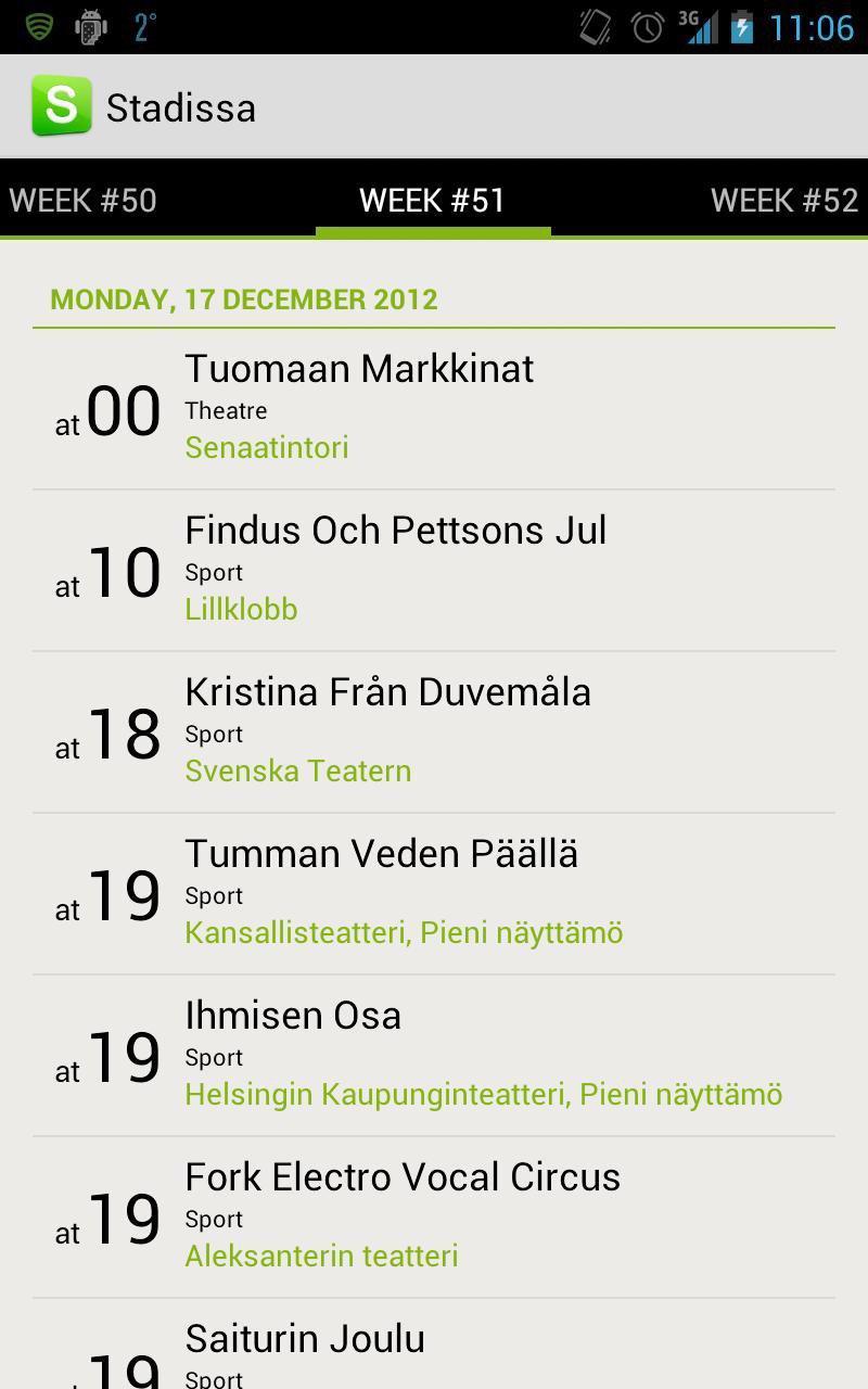 Stadi for Android allows you to view all the upcoming events in Helsinki. You can view events sorted by dates and quickly swipe between weeks to see events in the future. You can view maps, get directions, buy tickets from your local ticket vendor, share events with your friends or add an event to your phone's calendar.