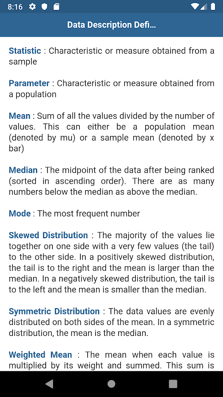 สถิติคือการศึกษาของคอลเลกชัน, การวิเคราะห์การตีความการนำเสนอและองค์กรของข้อมูล จาก app นี้คุณจะสามารถที่จะเรียนรู้สถิติ