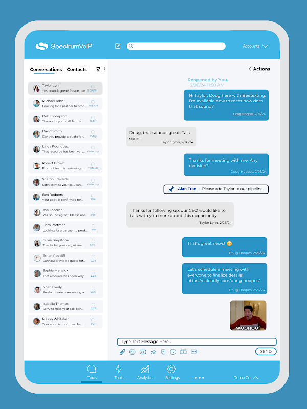 Stratus Texting เป็นแอปส่งข้อความทางธุรกิจที่ทีมขายและบริการใช้เพื่อสร้างความสัมพันธ์ที่แน่นแฟ้นยิ่งขึ้นกับลูกค้าและลูกค้าของตน ทีมงานชอบเพราะมันเป็นมากกว่าซอฟต์แวร์การตลาดสำหรับการส่งข้อความจำนวนมาก เป็นแพลตฟอร์มการส่งข้อความทั้งหมดหรือ CRM SMS/MMS สำหรับทีมในการสนทนาสนทนาระหว่างกันและกับลูกค้าผ่านทางข้อความ ทีมของคุณสามารถเข้าถึงบริการจากคอมพิวเตอร์เดสก์ท็อปหรือระหว่างเดินทางด้วยแอปนี้