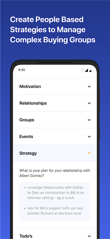 Stringboard ช่วยให้คุณได้รับข้อตกลงการขายระดับองค์กรที่มีมูลค่าสูงมากขึ้นด้วยแผนที่ผู้มีส่วนได้ส่วนเสียแบบโต้ตอบ จัดการและติดตามผู้มีอิทธิพล ความสัมพันธ์ที่สำคัญระหว่างการซื้อสมาชิกในทีม และตรวจสอบการเมืองในสำนักงานเพื่อสำรวจองค์กรการจัดซื้อที่ซับซ้อนอย่างมีกลยุทธ์ ขายอย่างมีประสิทธิภาพมากขึ้น และปิดดีลการขายระดับองค์กรที่ใหญ่ที่สุดของคุณได้เร็วขึ้น