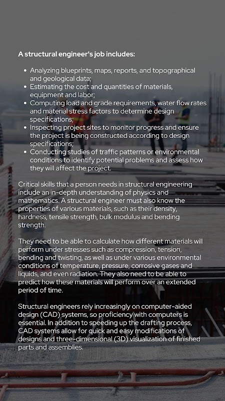 วิศวกรโครงสร้างออกแบบอาคาร สะพาน และโครงสร้างประเภทอื่นๆ พวกเขาสร้างโมเดล 2D และ 3D โดยใช้เทคโนโลยีการออกแบบโดยใช้คอมพิวเตอร์ช่วย (เช่น AutoCAD) พวกเขาวัดโหลดและกดเพื่อรักษาความมั่นคงของโครงสร้าง หน้าที่ของวิศวกรโครงสร้างยังรวมถึงการร่วมมือกับผู้รับเหมาและแนะนำคนงานก่อสร้างในสถานที่