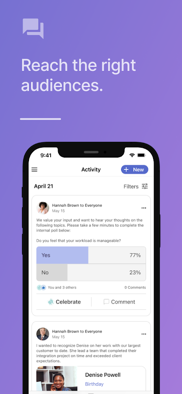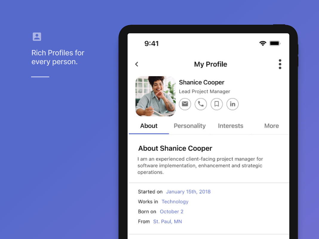 โครงสร้างรวบรวมข้อมูลบุคลากรของคุณเพื่อสร้างองค์กรที่คล่องตัวเชื่อมต่อและมีประสิทธิผลมากขึ้น โปรไฟล์ที่หลากหลายช่วยให้ทุกคนในองค์กรของคุณสามารถเข้าถึงความสามารถที่มีอยู่อย่างเต็มรูปแบบด้วยทักษะการสัมผัสประสบการณ์รายละเอียดการติดต่อโครงสร้างรายงานและอื่น ๆ เครื่องมือการสื่อสารและการแบ่งส่วนของโครงสร้างช่วยให้คุณสามารถส่งข้อความที่ถูกต้องไปยังกลุ่มเป้าหมายที่เหมาะสมและรวบรวมข้อเสนอแนะแบบเรียลไทม์ ยิ่งไปกว่านั้นการแจ้งเตือนอัจฉริยะและทรัพยากรตามความต้องการช่วยให้คุณได้รับข้อมูลที่ทันสมัยพร้อมเหตุการณ์สำคัญวันเกิดนโยบายและข่าว บริษัท