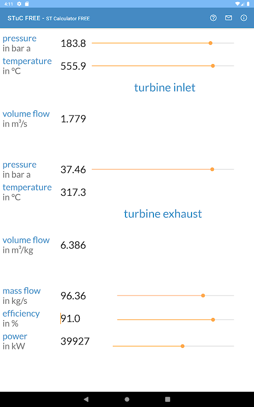 คุณสามารถแก้ไขเงื่อนไขขอบเขตได้อย่างง่ายดายโดยใช้แถบเลื่อนแอป สำหรับการคำนวณความดันขาเข้าแต่ละครั้ง จำเป็นต้องมีอุณหภูมิขาเข้าและความดันไอเสีย สามารถคำนวณกำลังกังหัน ปริมาตรการไหล และอุณหภูมิไอเสียได้