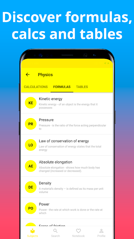 Study mate (home work cheat) includes 4 sections: calculators (calcs), formulas, theory and tables.