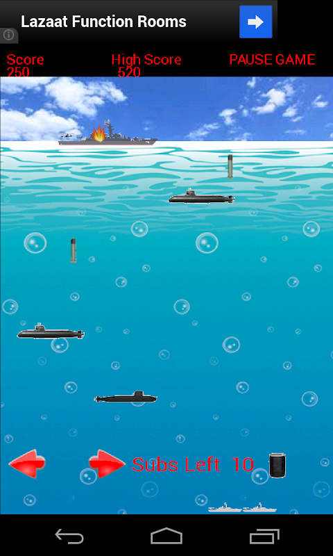 Old school shoot em up arcade game. You control the battleship at the top of the screen and your job is to destroy wave after wave of enemy subs. Your battleship will take 3 hits before it sinks to the bottom of the ocean, and you do have 3 battleships in your fleet. Lookout for the friendly fireboat who will quench all fires on your ship at the end of each level. Extra life at every 1000 points.