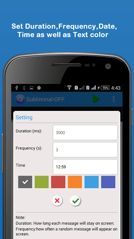Under setting You can set time in current day , as when you want to see the sequence of message blinking on the screen. you can set the frequency and duration of both text message as well as image to motivate you as well as promote your mind to .