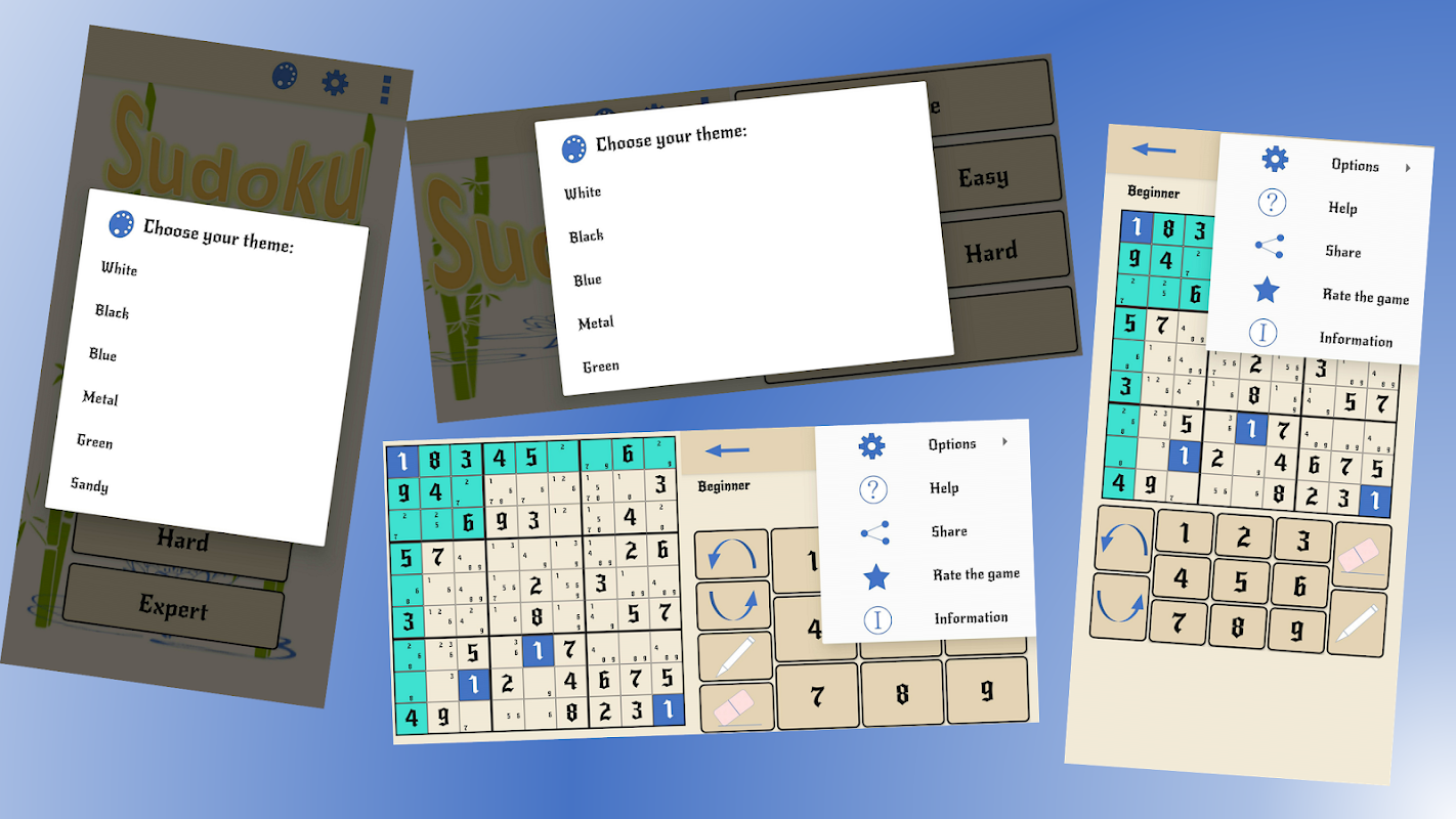 แอพนี้มี 5 ระดับที่แตกต่างกัน: เริ่มต้นง่ายปกติยากและผู้เชี่ยวชาญเพื่อช่วยคุณเลือกระดับที่เหมาะสมสำหรับคุณ ปริศนาของเรามีฟังก์ชั่นบางอย่างที่ทำให้เกมง่ายขึ้นสำหรับคุณเช่นโน้ตอัตโนมัติและการไฮไลต์ตัวเลขที่ซ้ำกัน