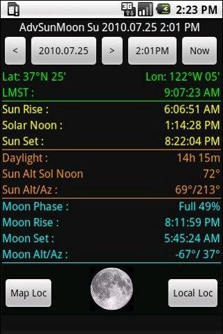 SunMoon computes rise/set times of the sun and moon for your GPS location. Also: solar noon time and sun altitude, sun alt/az, moon phase.
