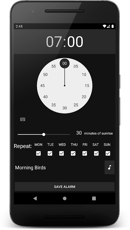 The wake up light alarm clock interface is simple and straightforward. The volume levels can be increased gradually instead of suddenly ringing your alarm, let your device vibrate on alarm, and set a decreasing snooze time for every time you snooze so you will have to get up! You can choose from several different sounds to wake up: from relaxed chirping birds and natural sounds, to a motivating Haka or a nuclear alarm sound, there is a perfect sound for every type of sleeper!