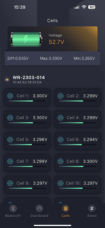 2. แสดงแรงดันไฟแบบเรียลไทม์และสถานะการเตือนของแบตเตอรี่แต่ละก้อน ถ้าค่าการเตือนหรือการป้องกันถูกทริกเกอร์ สัญญาณเตือนจะถูกสร้างขึ้น
