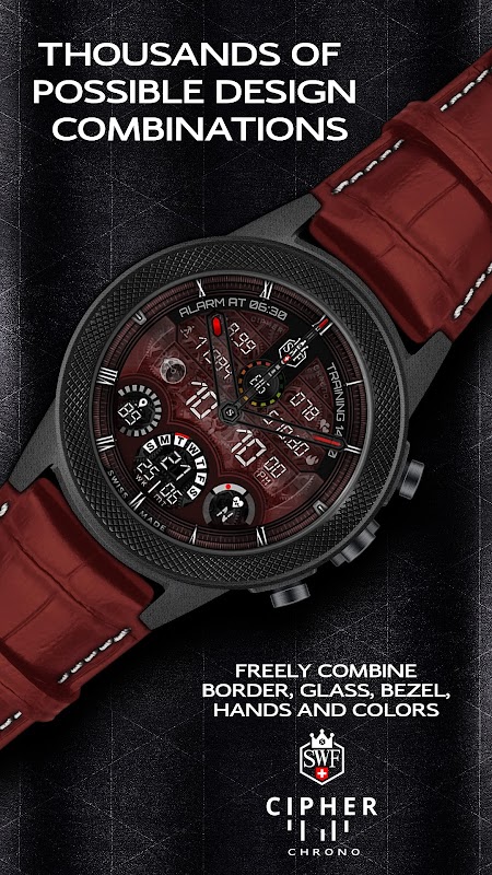 SWF Swiss Watch Faces สร้างสรรค์และผลิตในประเทศสวิสเซอร์แลนด์และแสดงรายละเอียดในระดับที่สูงมาก SWF Cipher ประกอบด้วยนาฬิกาเคลื่อนไหวที่สวยงามและหน้าปัด AOD หลากสีสำหรับนาฬิกาของคุณ ดังนั้นคุณจึงสามารถเปิดนาฬิกาไว้ได้ตลอดเวลาในขณะที่คุณเดินทาง