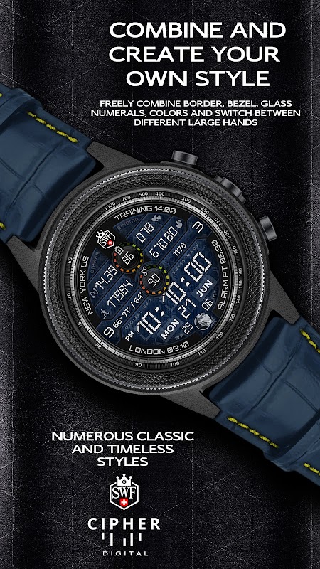 SWF Swiss Watch Faces สร้างสรรค์และผลิตในประเทศสวิสเซอร์แลนด์และแสดงรายละเอียดในระดับสูงมาก SWF Cipher ประกอบด้วยกลไกนาฬิกาที่เคลื่อนไหวได้สวยงามและหน้าปัด AOD แบบสีสูงสำหรับนาฬิกาของคุณ คุณจึงเปิดนาฬิกาทิ้งไว้ได้ตลอดเวลาในขณะที่คุณเดินทาง