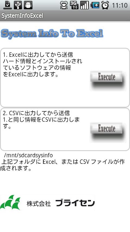 "SystemInfo to Excel" is an asset management software for Android. "SystemInfo to Excel" gathers hardware and installed software information from your Android? devices and outputs them in Excel format. You can also e-mail the output with "SystemInfo to Excel".
