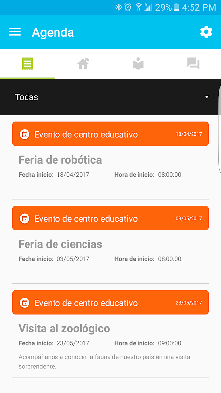 ในส่วนนี้ทั้งหมดได้รับมอบหมายการบ้านและกิจกรรมของโรงเรียนปรากฏ พวกเขาจะถูกจัดเรียงตามวันและมีความแตกต่างด้วยสี คุณสามารถใช้ส่วนกรองเพื่อดูวาระการประชุมหรือแสดงเฉพาะประเภทที่เฉพาะเจาะจงของรายการเช่น "โรงเรียนเหตุการณ์"