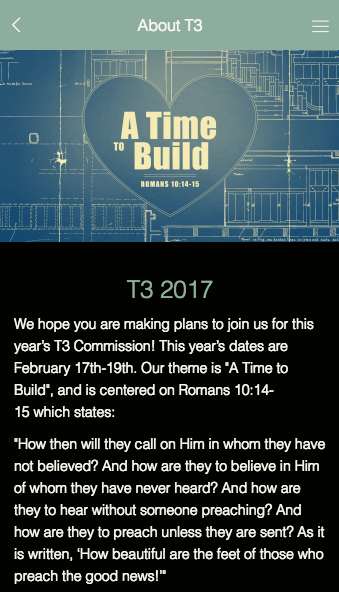 T3 Commission is an annual youth evangelism conference held every February at the Lewisville Church of Christ in the DFW area. This app is primarily a source of information concerning the conference including updates and registration information.