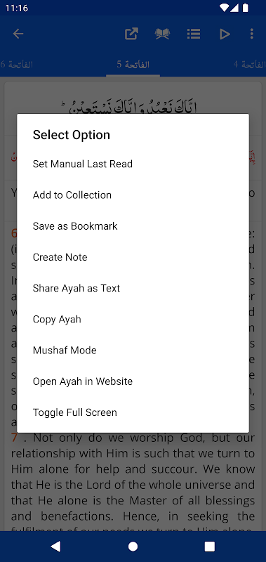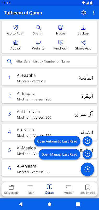 - โหมด Mushaf: ท่องคัมภีร์กุรอานด้วยการแปล (Tarjuma) หรือ Tafseer