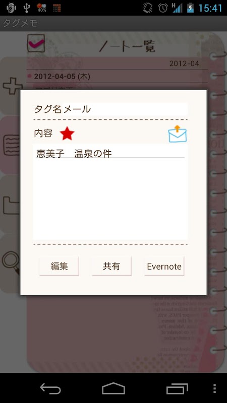 TagMemo ง่ายมาก! คุณสามารถจัดระเบียบบันทึกย่อโดยการตั้งชื่อแท็กเลือกชื่อแท็กหลายแห่งในหนึ่งทราบและติ๊กในช่องทำเครื่องหมายเมื่อมีการกระทำเพื่อให้คุณสามารถใช้มันเป็นผู้จัดรายการที่ต้องทำ! คุณสามารถแบ่งปันบันทึกโดยการส่งอีเมล์และ Evernote!