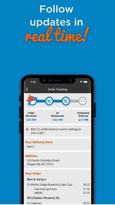 เมื่อคำสั่งซื้อของคุณใกล้จะถึงที่หมายแล้วแอปของคุณจะช่วยคุณในการวนซ้ำ คุณจะรู้ว่าอยู่ที่ไหนและเวลามาถึงของอาหารและสามารถทักทายด้วยส้อมในมือ