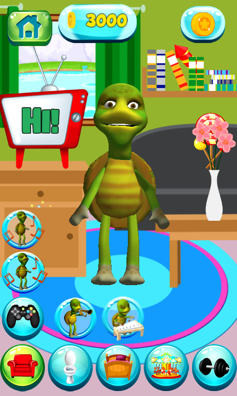 This top talking animal can dance, jump, run and do many interesting things! He has a beautiful playground, and many great rooms. He has a nice bedroom and a comfortable bed where he likes to be tucked in. So when it’s time to sleep, you can just turn off the lights and the turtle can rest. The drums will wake him up in the morning. He has the best home gym ever! You will see his treadmill where you can make him run or walk. It is important to stay in shape and to exercise regularly. The popular turtle has its own toothbrush! Cleanliness is very important for your hero. So in the bathroom, he can take a bath and brush his teeth. Later he can wipe with the towel. You and your pet will have fun together, and collect coins to unlock the other rooms, so it is time for fabulous latest mini games. Open Jumpy Turtle and hop on endless platforms and try to cross them as much as possible. In Pizza Defense you need to protect this delicious food from nasty bugs and insects, such as caterpillars and spiders. Play Turtle Smash, use your hammer and hit your pet as soon as you see him get out of the pit, but you have to be very quick, so concentrate yourself. The last one is Turtle Jump, just tap the platform that you want your hero to jump on and achieve the maximum height. The newest talking game is perfect for people of all ages! Everyone can have the coolest virtual pet. Tap the drawer in the living room to see a magic hat with a rabbit, or click on the the vase to see colorful lollipops! Have you seen his bookshelf? If you tap on it the firecracker will appear. He hides musical talent, so you will be impressed when you hear him play the xylophone and trumpet. Let’s come outside and you will notice the fish that jumps out of the river and you will also see little butterflies flying into the woods. Check out his playground and have fun playing the amazing sports with him! There is also an awesome trampoline where he can jump. Talk to the turtle and he will listen carefully. He will then be able to repeat your words. You will surely get a smart friend.