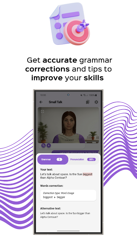 รับการแจ้งเตือนส่วนบุคคลเพื่อเริ่มการสนทนาตลอดทั้งวัน เพื่อฝึกฝนภาษาในสถานการณ์จริง ใช้ประโยชน์จากความสามารถในการเลือกอวตารและเสียงของคนดังเพื่อทำให้ประสบการณ์สนุกสนานและเป็นส่วนตัวมากยิ่งขึ้น