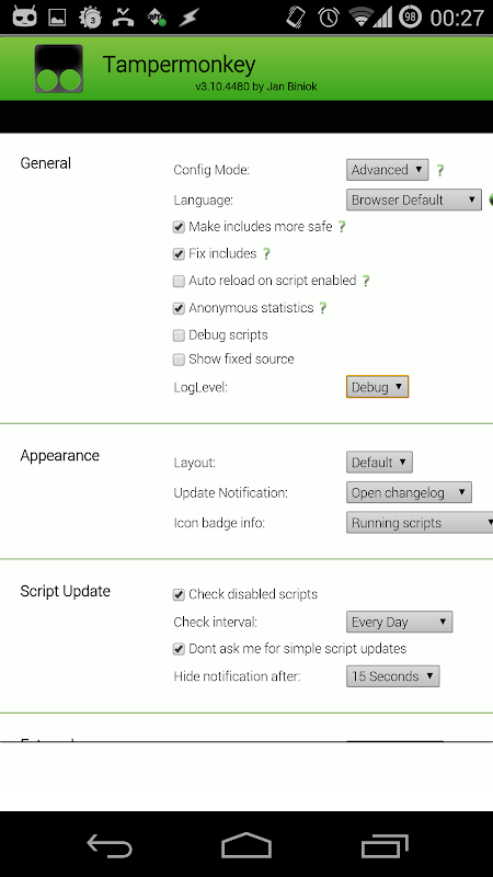 ถ้ารอยด์ 4.4 หรือสูงกว่าและ Dolphin 11 จะใช้ JetPack จะต้องเปิดการใช้งานเพื่อให้ Tampermonkey ทำงาน!