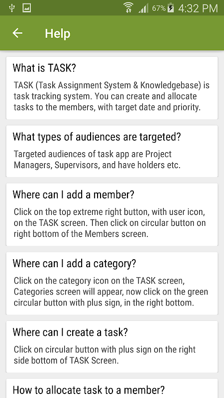 TASK (Task Assignment System & Knowledgebase) is task tracking App to helps managers and have holders to create and allocate tasks to the members, with category, target date and priority. Created tasks can be shared via Whatsapp or mail to the members. Sequentially, created tasks can have 3 status viz. waiting, working and done.