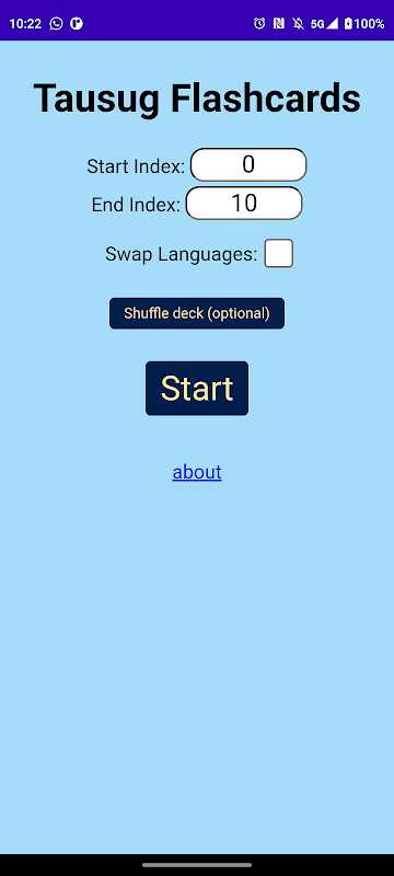 วัตถุประสงค์ของแอปนี้คือช่วยให้คุณจดจำสำนวนทั่วไปและคำศัพท์ที่เป็นประโยชน์ในภาษา Tausug หรือที่สะกดว่า Tausūg ได้เช่นกัน ในการใช้งานแอป เพียงระบุช่วงของไพ่ที่คุณต้องการสลับจากชุดไพ่ทั้งหมด คุณยังสามารถสลับภาษาที่จะแสดงก่อนได้โดยการสลับช่องทำเครื่องหมาย "สลับภาษา" คลิกเริ่ม แล้วไพ่ในช่วงที่คุณเลือกจะถูกสับเปลี่ยน การคลิกที่ไพ่ใบบนสุดของกองไพ่จะแสดงคำตอบ รวมถึงเลื่อนไพ่ลงและเก็บให้พ้นทาง หากคุณคลิกไพ่อีกครั้งหลังจากที่เปิดไพ่แล้ว ไพ่จะถูกย้ายไปที่กอง "เล่นซ้ำ" เพื่อให้คุณสามารถลองเล่นซ้ำได้ในภายหลัง