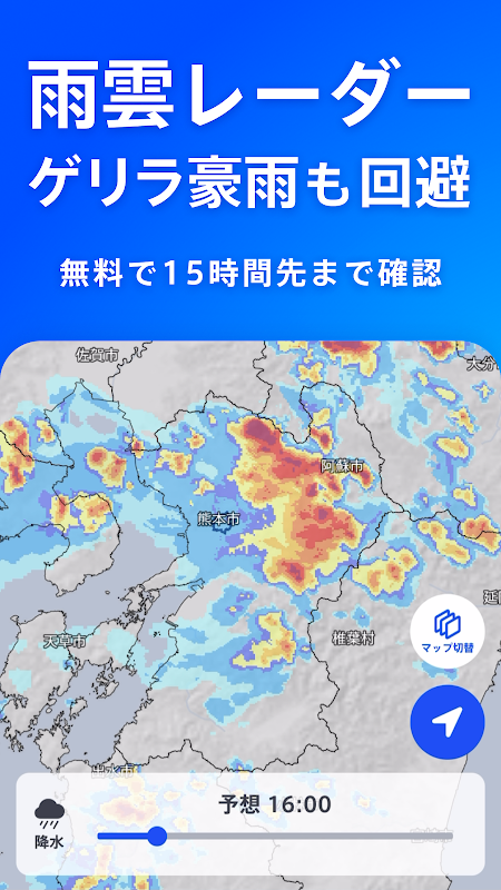“ฝนจะตกเมื่อไหร่จะหยุดเมื่อไหร่?” นี่คือเรดาร์เมฆฝนที่สามารถใช้ได้ในชีวิตประจำวันตลอดจนเมื่อคุณต้องระวังภัยพิบัติที่มีฝนตกหนัก ในการใช้งานในชีวิตประจำวัน จะมีประโยชน์ในการตรวจสอบการเคลื่อนที่ของเมฆฝนอย่างรวดเร็วเมื่อมีฝนตกกะทันหัน และใช้ในการตัดสินใจว่าจะออกไปข้างนอกพร้อมกับร่มหรือไม่ คุณสามารถตรวจสอบการเคลื่อนที่ของเมฆฝนได้ล่วงหน้าถึง 15 ชั่วโมง จึงมีประโยชน์เมื่อคุณตื่นขึ้นมาในตอนเช้าและตรวจสอบสภาพอากาศในวันนั้น และเมื่อคุณคิดว่าจะสวมชุดอะไรในวันถัดไปก่อนเข้านอน กลางคืน.