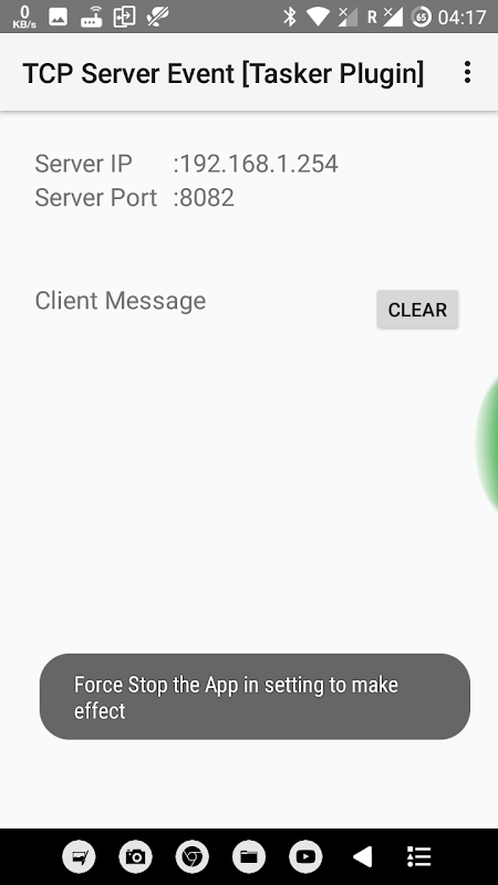 This app will send an Intent to the Broadcast Receiver whenever a message is receive in the its TCP server port. This can trigger tasks in Tasker app.