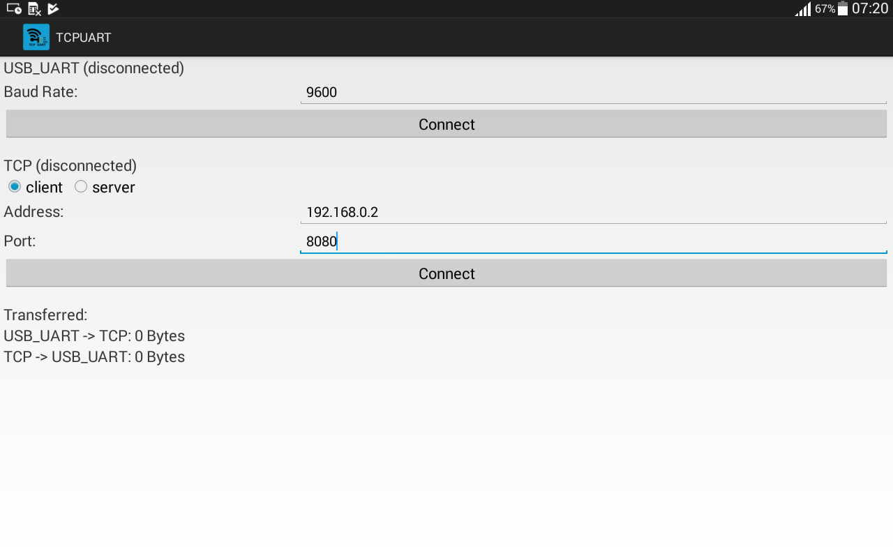แอปพลิเคชั่นนี้ให้คุณเชื่อมต่ออะแดปเตอร์ USB UART (อนุกรม) เข้ากับซ็อกเก็ต TCP เพื่อส่งและรับข้อมูล