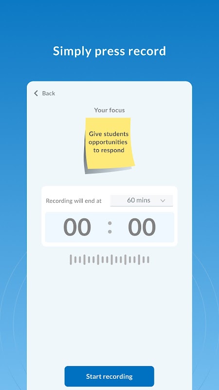 แอป TeachFX ช่วยให้ครูผู้สอนมีข้อมูลที่นำไปปฏิบัติได้เกี่ยวกับการสอนในชั้นเรียนและการมีส่วนร่วมของนักเรียน เราใช้แมชชีนเลิร์นนิงผ่านเสียงในห้องเรียนเพื่อให้คุณได้รับข้อมูลเชิงลึกด้านการสอน เช่น อัตราส่วนการพูดคุยระหว่างครูกับนักเรียน การออกแบบบทเรียน ภาษาวิชาการ เทคนิคการตั้งคำถาม เวลาคิด การกลับตัว และรูปแบบการมีส่วนร่วม เพียงบันทึกชั้นเรียนของคุณบน TeachFX โดยใช้อุปกรณ์มือถือหรือคอมพิวเตอร์ แล้วเราจะส่งรายงานชั้นเรียนของคุณภายในไม่กี่ชั่วโมง ในรายงานของชั้นเรียนนี้ คุณจะสามารถฟังบทสนทนาในห้องเรียนของคุณ มุ่งเน้นไปที่ช่วงเวลาใดช่วงเวลาหนึ่ง และไตร่ตรองการฝึกสอนของคุณ ลองวันนี้!