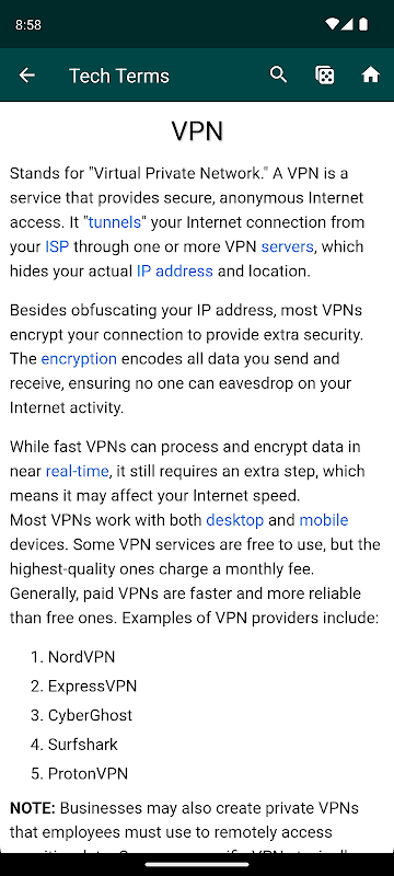 เป้าหมายของพจนานุกรมคอมพิวเตอร์ข้อกำหนดทางเทคนิคคือการทำให้คำศัพท์เกี่ยวกับคอมพิวเตอร์เข้าใจง่าย คำจำกัดความเขียนไว้อย่างชัดเจนและกระชับ และมักให้ตัวอย่างวิธีใช้คำศัพท์ในชีวิตจริง คุณสามารถค้นหาและเรียกดูพจนานุกรมทั้งหมด บันทึกรายการโปรด และกลับมาอ่านคำจำกัดความรายวันในแต่ละวัน