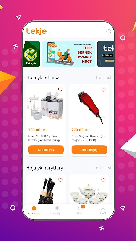 Tekje onlaýn marketi ýokary hilli hyzmaty bermek bilen bir hatarda ýurdumyzyň we dünýäniň ýokary hilli brendlerinden, müňlerçe harydy tiz wagtda, amatly bahalar bilen öz mhädderilerine.