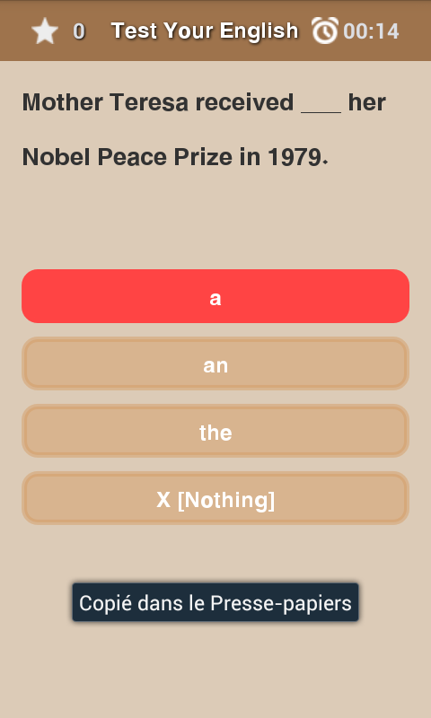 Game to test your level of English, in the form of questions and four choices. Think the right answer and do not exceed the timer.