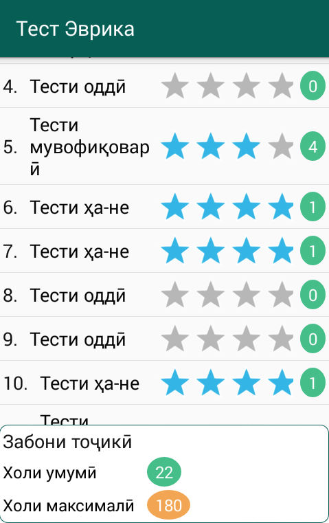 Барномаи зерин барои таёрӣ ба имтиҳонҳо ва худомӯзӣ пешбинӣ шудааст. Дар базаи барнома зиёда аз 1000 фан мавҷуд аст, ки ҳар яки ин фанҳоро Шумо ройгон метавонед нигаҳдорӣ намоед. Ҳоло барнома 5 намуди тестҳоро дастгирӣ мекунад ва дар оянда метавонад дигар намуди тестҳоро низ дастгирӣ кунад. Дар барнома имконияти танзим намудани фанҳо мавҷуд буда, Шумо метавонад шумора, вақт ва холи тестҳоро идора кунед. Қисми асосии тестҳо ба Донишгоҳи Давлатии Хуҷанд (ДДХ - ХГУ) таълуқ дошта, тестҳои Маркази Миллии Тестӣ низ ворид карда шудаанд. Ин барномаро Шумо, донишҷӯён, довталабон, омӯзгорон ва дигар шахсон низ метавонед ройгон истифода баред.