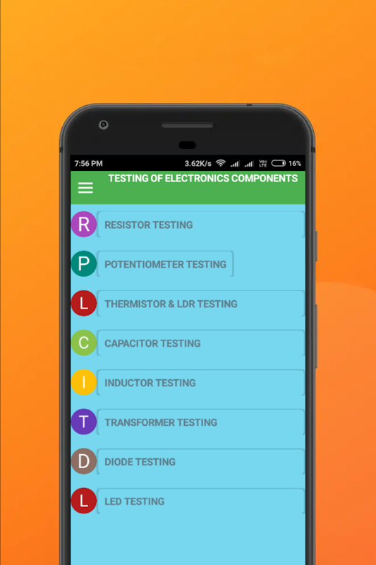 This app will help you to test various Electronic components. Following are the topics given below: