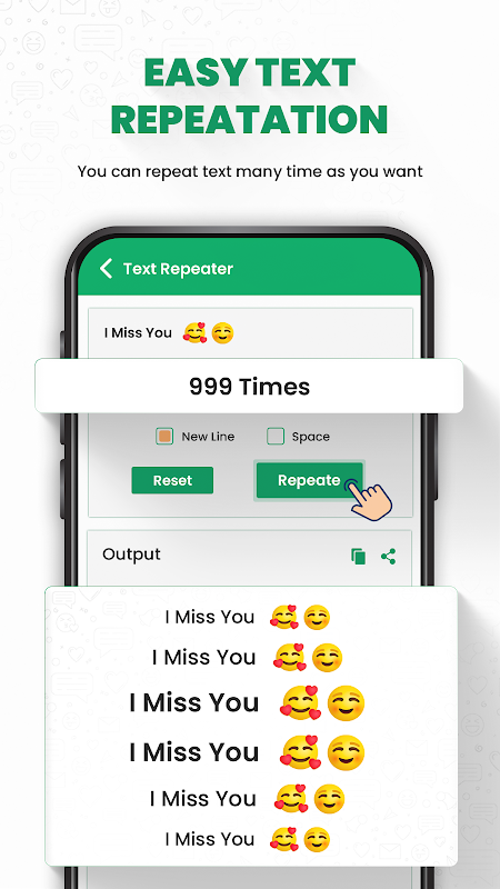 ✔️ ตัวทำซ้ำข้อความ: ทำซ้ำข้อความของคุณหลายครั้งในบรรทัดเดียว เพิ่มการเน้นและสร้างเอฟเฟกต์ที่ดึงดูดสายตา คุณสมบัติ Text Repeater ช่วยให้คุณปรับแต่งจำนวนการทำซ้ำและเค้าโครงให้เหมาะกับความต้องการของคุณ
