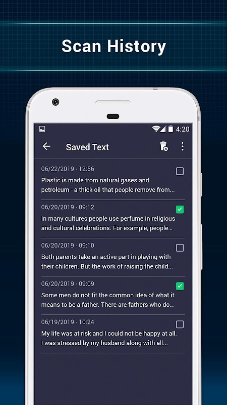 + From saved documents, you can delete, copy, share or create PDF files.