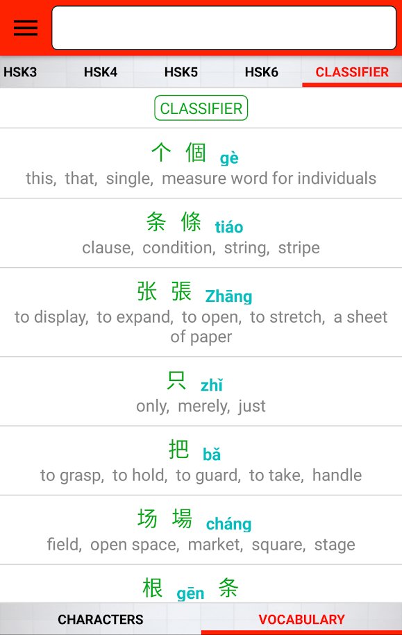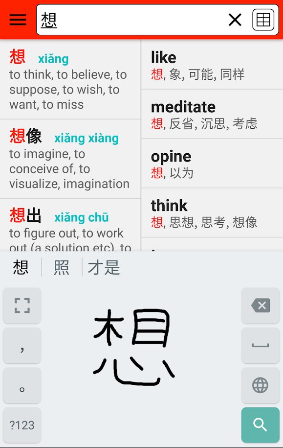 • The most Powerful search: look up words by English, Chinese characters, Pinyin (Number and Tone Mark), or a combination, support for wildcards and full-text search both Chinese and English and also able to show results in duo-list at once.